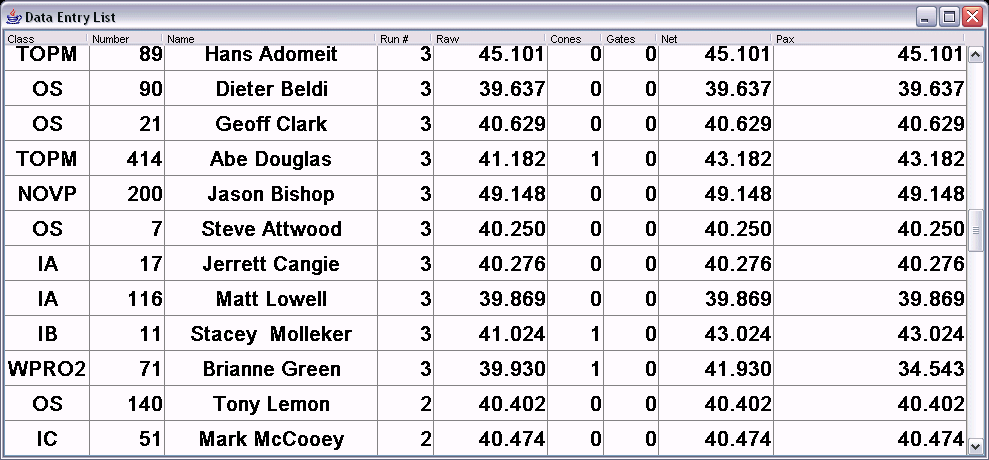 This gui simply lists the last entries/changes made to the database in order. The last entry is always the latest entry or change. This GUI can be used by the posting person for posting written results in addition or subsitution to listening to the announcer. For classes that are indexed, the PAX column will show the final indexed value for the run.