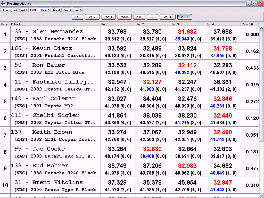 This posting sheet is dynamically updated with each run providing the latest results viewable by multiple people at a time. It provides indexed results as well as the calculated raw times for improving one position. The downside is that to use such a large font, only one sheet is viewable at a time. For this reason, its probably best to use it for indexed classes where it provides the most benefit.